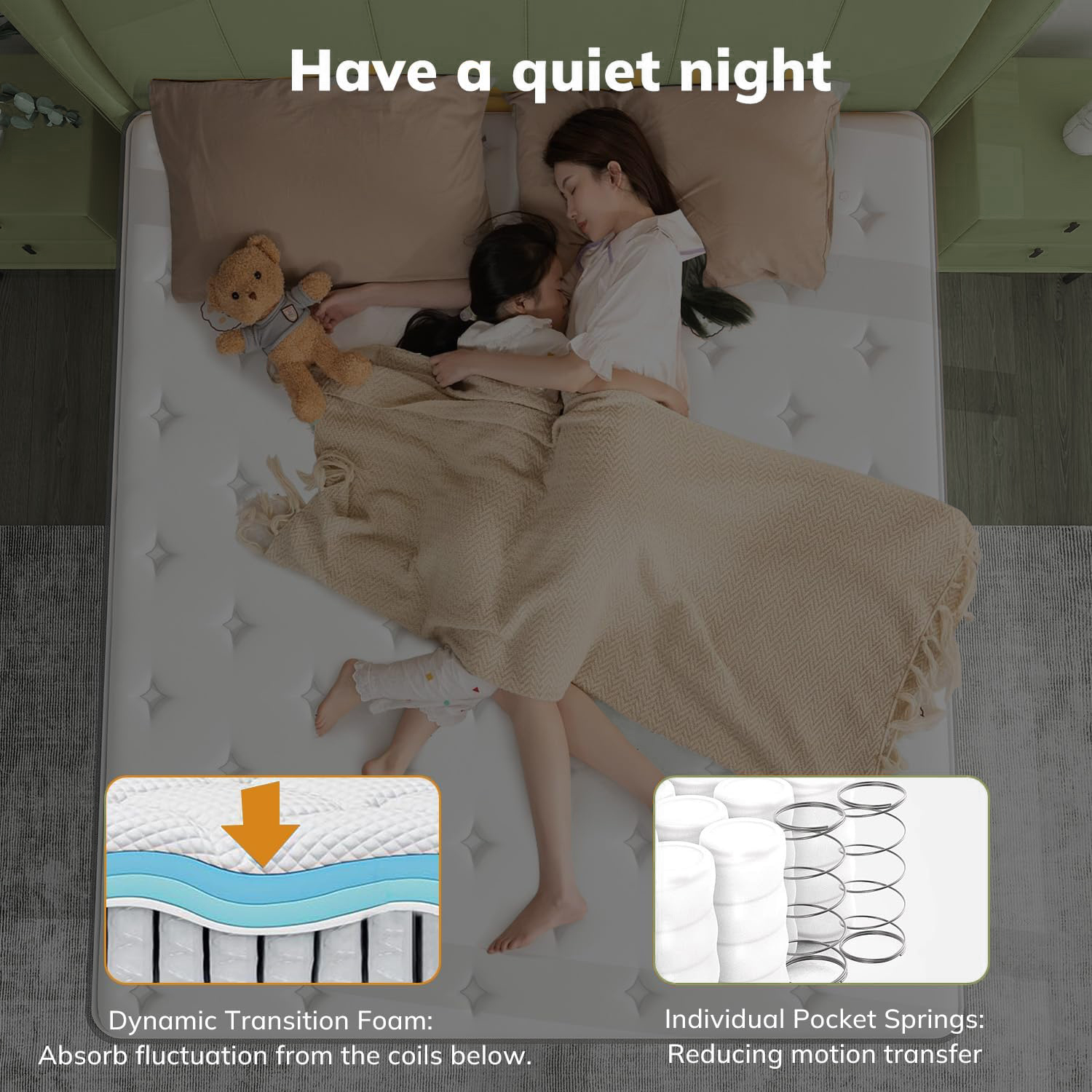- Individually Pocket Spring System: The pocket springs can operate independently to support the force,turn on the zero-sound mode,and turn over all night without disturbing the sleeping partner,ensuring a comfortable sleeping,which can effectively promote deep sleep and improve sleep quality.